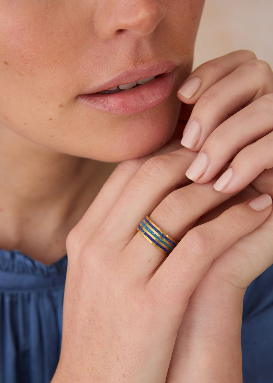 Wondrously unique 18kt gold vermeil Farkhunda band ring featuring lapis lazuli and turquoise inlay, handmade in Kabul by the talented artisans of Turquoise Mountain.