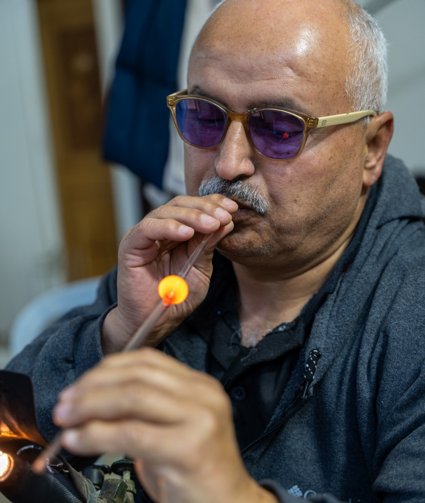 In the spring of 2025, Pippa travelled to Jaba’, Palestine, to meet Palestinian glassblower Mohammad Twam, whom she was introduced to through Turquoise Mountain. Twam is a master of his craft and has been working with glass for over 40 years. In collaboration with Twam, the ‘Azaz’ – meaning ‘glass’ in local Palestinian dialect – collection was created. Made entirely of handblown glass, the Azaz collection was inspired by ancient beads that have been worn, handled, and loved for centuries.