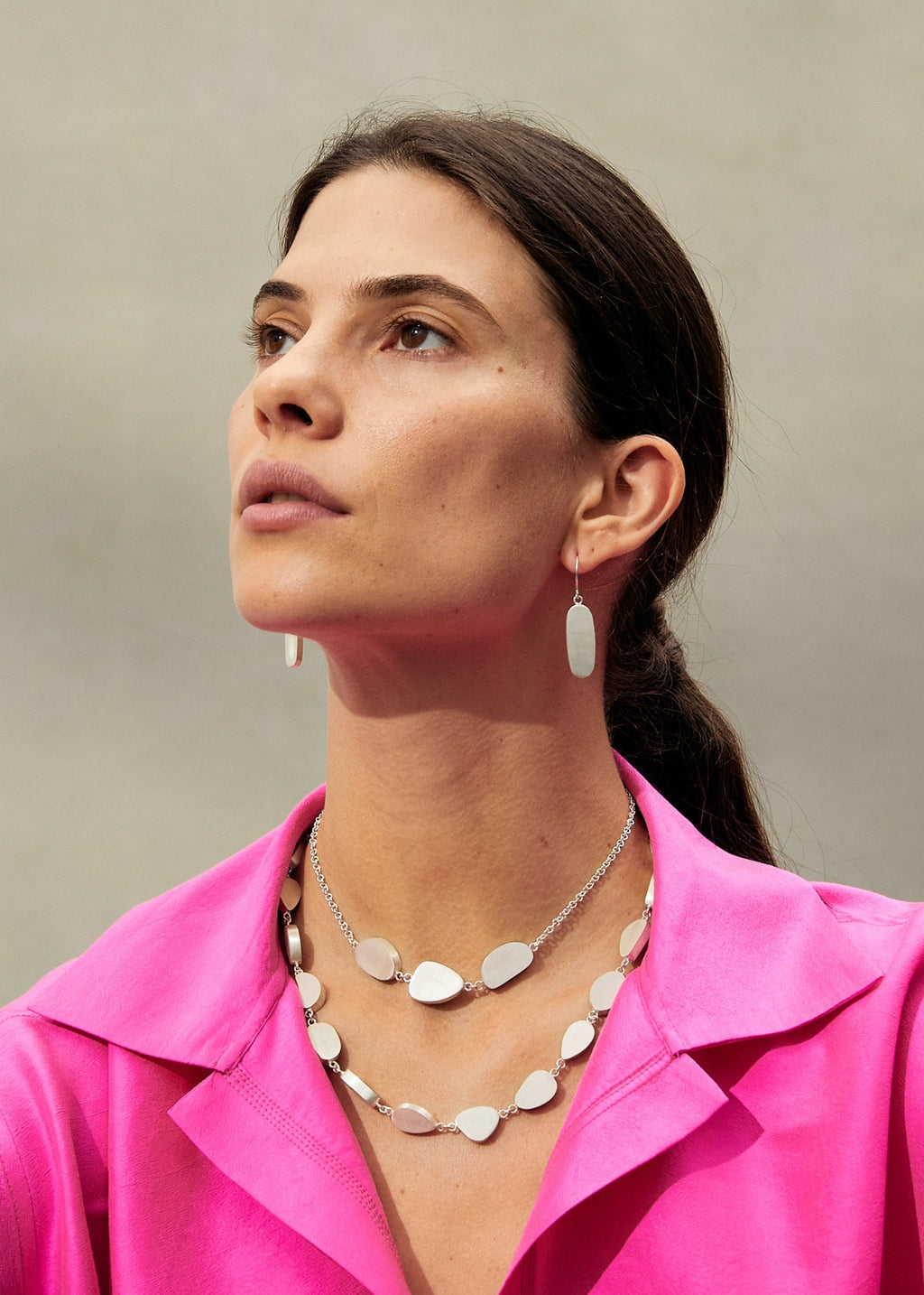 Created in Kabul by the skilled artisans of Turquoise Mountain Afghanistan, the collection brings together long, fluid strands of simple silver discs, timeless silhouettes, and a bold, clean, large-linked chain that has a subtly androgynous, contemporary effect. Each piece is imbued with the touch of the maker’s hand - celebrating heritage, honouring tradition, and supporting sustainable livelihoods.